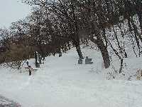 途中の樹林帯で「ピシッ、ズン!!」といった鈍い音が一瞬起きた。ん、雪崩??かなと思ったが斜度は15度くらいだしこの樹林帯では心配なかろうと辺りを見回す。すると2mほど前にスッと一条の線がずっと走っている。よく見るとやはり雪の層が分断されたひびである。う〜ん、こんな形で雪崩が起きるのか、勾配が緩やかでよかったなあと胸をなで下ろす。で、後学のため、その断層のところを横にずっと掘ってみると、まぎれもなくわずかずれた形跡が見られた。積雪量は50〜60cm位だった。いやあ、さっきの急な下り斜面でこんな風になったらと思うと急に怖くなってきた。無事下山