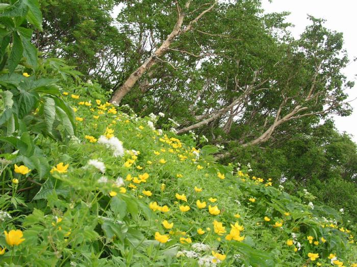 斜面を彩る黄色の絨毯。ダケカンバとのコントラストが綺麗でした。
